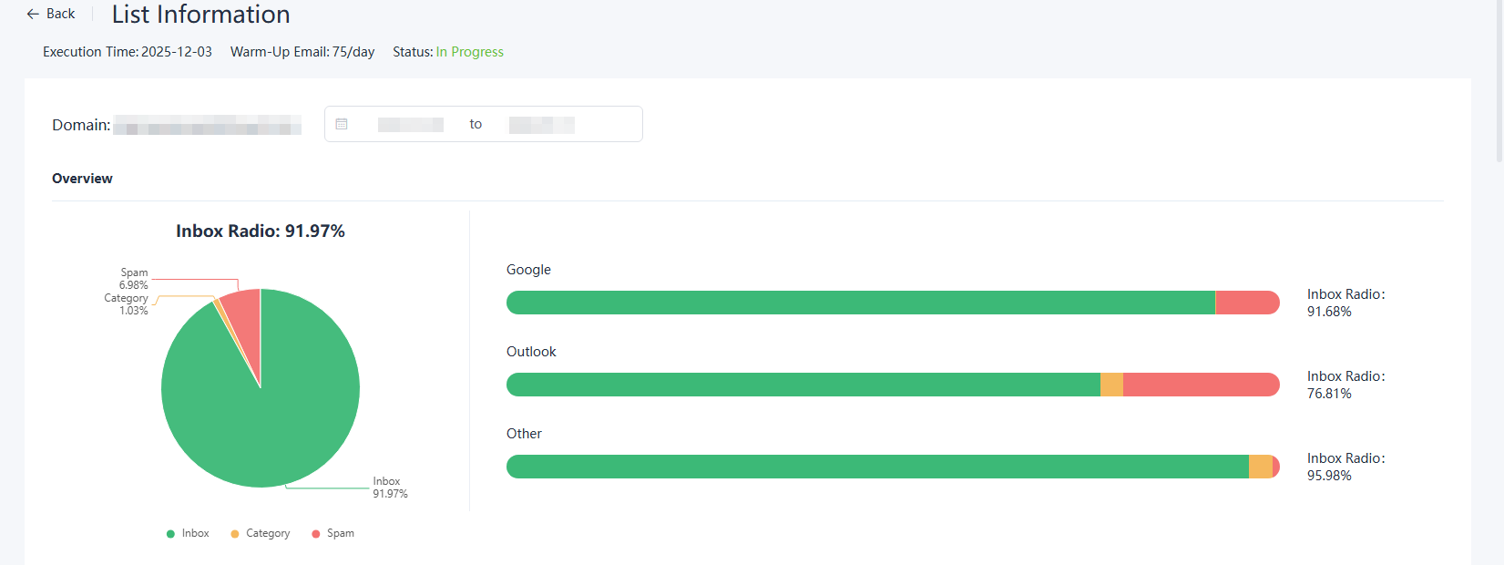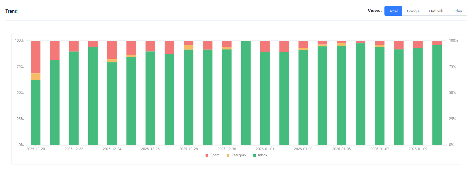 トレンドでは、ウォームアッププロセス中の受信トレイ結果の変化を観察できます。以下のチャートでは、ウォームアップが進むにつれて受信トレイ率が徐々に増加する様子が確認できます。