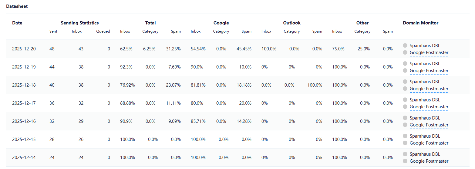 データシートを通じて、ドメインごとの日次送信状況を確認できます。設定の初期段階では、低い初期送信量から開始し、徐々に増加させます。大量のメールを即座に送信するよりも、メール活動をゆっくりと着実に増やす方が安全です。