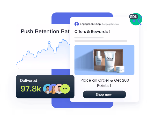 EngageLab 推播通知服務整合通知欄/大圖/全屏/彈窗等 8 種互動樣式,搭配富媒體訊息(圖片、按鈕、deeplink 等)、iOS 鎖屏即時活動(如外賣進度),透過應用內訊息補推、行為追蹤閉環等機制,實現通知權限關閉用戶的前臺訊息強觸達,助點擊率提升 30%+